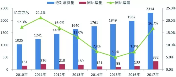2017年1~10月全國(guó)天然氣絕對(duì)消費(fèi)量1842.9億立方米,同比增加275.7億立方米。預(yù)計(jì)全年天然氣消費(fèi)量2314億立方米,增量332億立方米,同比增長(zhǎng)達(dá)到16.8%。其中,2017年前半年同比增量超過(guò)2014~2016年的全年增量,二、三季度的月度同比增速均在20%以上,全年增量是2010~2016年年均增量的兩倍以上,刷新我國(guó)消費(fèi)增量的歷史,呈現(xiàn)爆發(fā)式增長(zhǎng)。