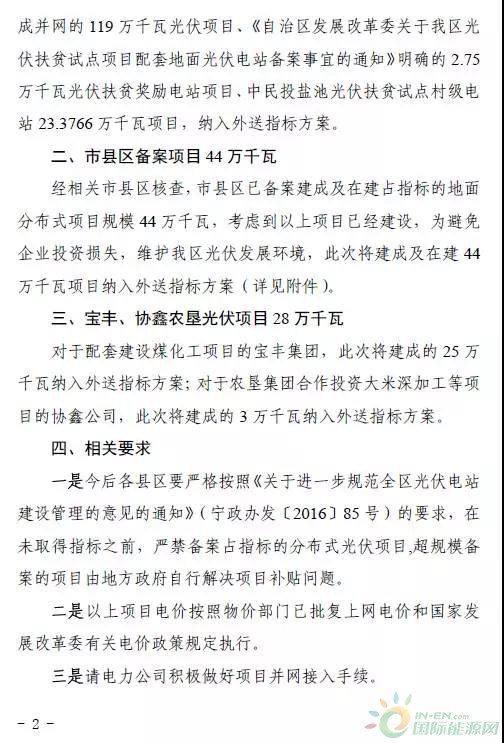 根據(jù)該文件顯示,寧夏有1.45GW自治區(qū)備案光伏項(xiàng)目、440MW市縣區(qū)備案的地面分布式項(xiàng)目以及280MW的寶豐、協(xié)鑫農(nóng)墾光伏項(xiàng)目被納入到外送指標(biāo)方案中,這意味寧夏這批2.17GW無指標(biāo)的建成(及在建)光伏電站的“戶口”問題被圓滿解決——此前這些電站只能拿到脫硫上網(wǎng)電價(jià),而無法拿到光伏標(biāo)桿上網(wǎng)電價(jià)。
