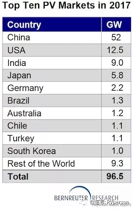 Bernreuter Research得到85個(gè)國(guó)家自下而上的光伏需求評(píng)估的支持,預(yù)計(jì)2017年全球安裝量為96.5GW,比2016年的超過74GW增長(zhǎng)30%。另一個(gè)指標(biāo)是同樣的方向:通過從四大模塊供應(yīng)商晶科,阿特斯,晶澳太陽能和韓華Q電池的總體出貨指導(dǎo)中推算出全球需求,貝納特勒研究在2017年得出了類似的結(jié)果。