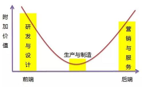 中國(guó)是制造業(yè)大國(guó),但還遠(yuǎn)非制造業(yè)強(qiáng)國(guó),隨著內(nèi)部和外部環(huán)境的不斷變化,中國(guó)的制造業(yè)也面臨著巨大的挑戰(zhàn)。從世界品牌實(shí)驗(yàn)室 2015 年發(fā)布的數(shù)據(jù)統(tǒng)計(jì)來看,在“世界品 牌 500 強(qiáng)”中,中國(guó)的企業(yè)也僅占 6%;中國(guó)汽車工業(yè)迄今為止所掌握的核心零部件技術(shù)還不到 20%。這就要提到微笑曲線(見圖1),將產(chǎn)業(yè)鏈分為研發(fā)與設(shè)計(jì)、生產(chǎn)與制造、營(yíng)銷與服務(wù)三個(gè)區(qū)間,可以看到,生產(chǎn)制造環(huán)節(jié)處在產(chǎn)業(yè)鏈低利潤(rùn)環(huán)節(jié),而兩端為高端位置,為高利潤(rùn)環(huán)節(jié)。目前我國(guó)大部分制造業(yè)還處在國(guó)際產(chǎn)業(yè)價(jià)值鏈的低端環(huán)節(jié),存在創(chuàng)新能力不強(qiáng)、核心競(jìng)爭(zhēng)力不足、產(chǎn)業(yè)集中度低、低端產(chǎn)品生產(chǎn)擴(kuò)張過度而高附加值產(chǎn)品依賴進(jìn)口等問題。