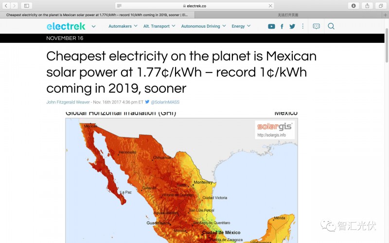 根據(jù)“electrek”的報(bào)道,日前墨西哥能源部2.3吉瓦/5.5TWh(55億度, 2020年入網(wǎng))光伏采購(gòu)競(jìng)標(biāo)結(jié)果日前出爐,意大利ENEL綠色電力公司報(bào)價(jià)1.77美分/kWh(相當(dāng)于人民幣0.11元/kWh),刷新不久前沙特阿拉伯1.79美分/kWh的光伏報(bào)價(jià)最低紀(jì)錄。文章認(rèn)為,2019年可能會(huì)出現(xiàn)1美分/kWh(相當(dāng)于人民幣7分/kWh)的報(bào)價(jià)。
