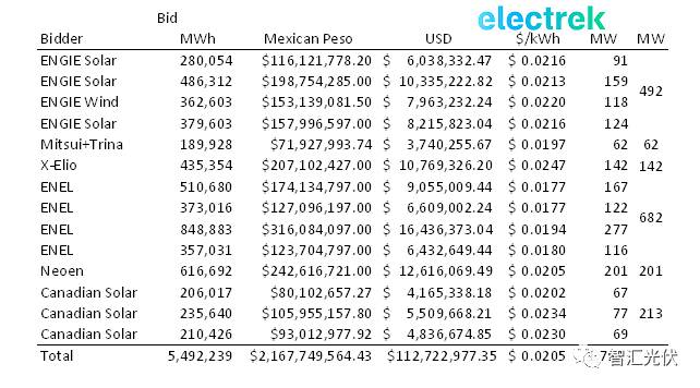 在這次墨西哥的光伏項(xiàng)目競(jìng)標(biāo)中,其他公司的平均報(bào)價(jià)為2.05美分/kWh。中國(guó)企業(yè)阿特斯的報(bào)價(jià)為2.02~2.34美分/kWh。具體各家的報(bào)價(jià)如下表。