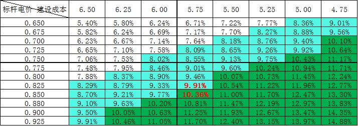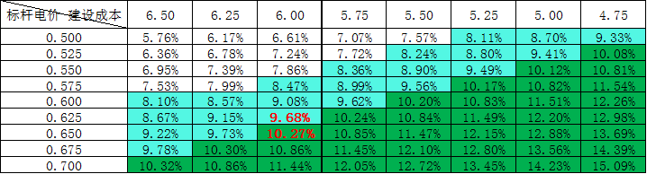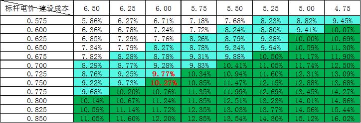 表:二類地區(qū)(1250小時(shí))在不同建設(shè)成本時(shí)的全投資項(xiàng)目收益率