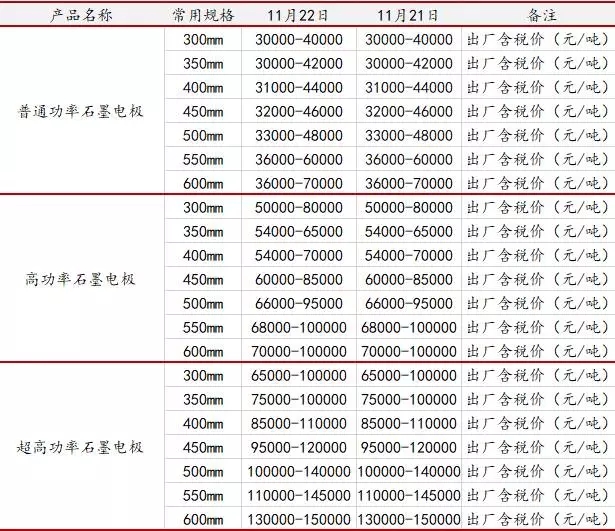 11月22日石墨電極主流成交參考價(jià)格(元/噸)