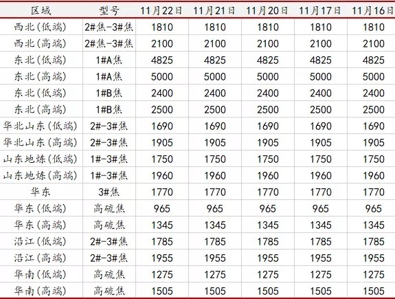 11月22日各地區(qū)石油焦價(jià)格情況(元/噸)