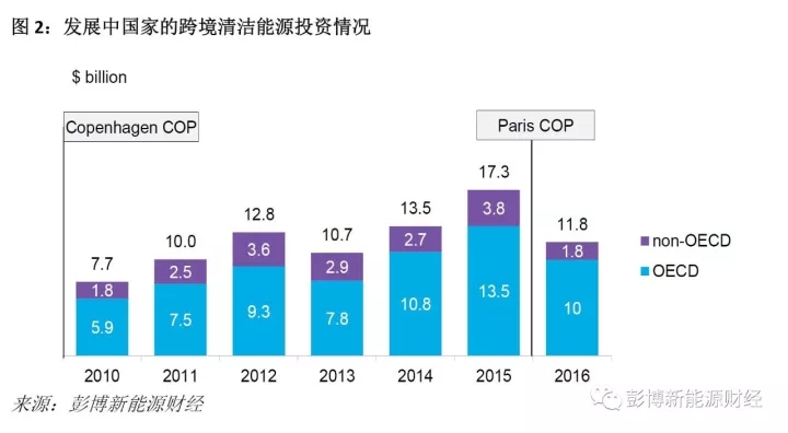 2009年12月,在哥本哈根舉行的極具歷史意義的聯(lián)合國氣候變化大會(huì)上,世界上最富裕的國家承諾,將每年向欠發(fā)達(dá)國家提供1000億美元(包括與氣候變化有關(guān)的所有形式的投資),共同解決氣候變化問題。然而,根據(jù)彭博新能源財(cái)經(jīng)Climatescope研究的統(tǒng)計(jì)數(shù)據(jù),幾乎沒有跡象表明清潔能源投資能為實(shí)現(xiàn)當(dāng)年大會(huì)的總體目標(biāo)而發(fā)揮顯著作用。我們發(fā)現(xiàn),2016年,“世界最富裕的經(jīng)合組織國家”向“較不發(fā)達(dá)的非經(jīng)合組織國家”的清潔能源專項(xiàng)投資僅為100億美元,較2015年的135億美元有所下降。這一數(shù)字包括了公共財(cái)政支持(絕大部分是通過各國發(fā)展銀行和進(jìn)出口機(jī)構(gòu)提供)和私人資本投資。