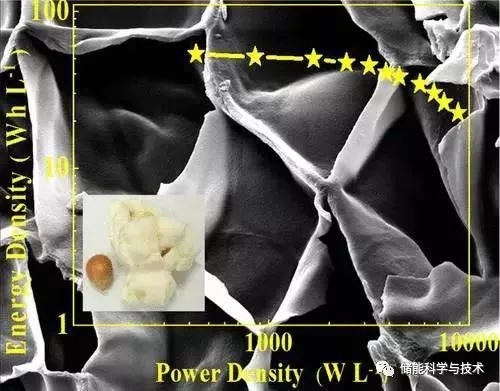 儲能材料的微觀結(jié)構(gòu)顯著影響著性能表現(xiàn)。微觀孔隙的設計不僅需要增加其比表面積,并且也需要供離子運輸?shù)目焖偻ǖ?,但材料合成具有挑?zhàn)性。侯博士和他的合作者在研究報告中制備出爆米花基碳片具有 “超高”比表面積的蜂窩狀結(jié)構(gòu),獲得在生物質(zhì)碳材料中具有最高能量密度的超級電容器器件。不僅如此,該方法綠色且易加工:微波膨化爆米花8分鐘后用氫氧化鉀活化即可。