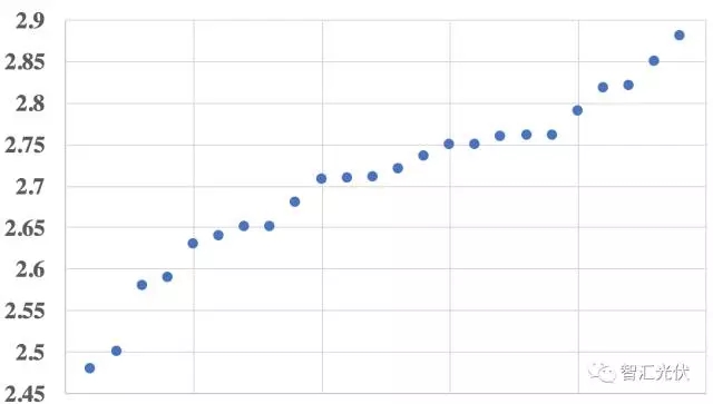 2個(gè)包的多晶硅組件報(bào)價(jià)為9家,具體報(bào)價(jià)情況分布如下圖。