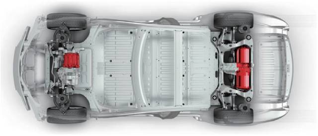與常規(guī)的全輪驅(qū)動車輛只用一臺發(fā)動機和變速箱分配能量、犧牲效率來換取牽引力不同,特斯拉的工程師們在后輪驅(qū)動 Model S 的基礎(chǔ)上,在前軸加裝了一臺電機,使之成為雙電機全輪驅(qū)動的 Model S(圖 6)。特斯拉采用三相四極交流感應(yīng)電動機,銅轉(zhuǎn)子,具有變頻驅(qū)動功能的驅(qū)動逆變器與動能再生制動系統(tǒng)。不僅體積小,重量輕,而且可以瞬時輸出到最大扭矩,并在全壽命內(nèi)基本無需保養(yǎng)。特斯拉 Model S 電動機還獲得 2014 年度國際最佳發(fā)動機大獎。