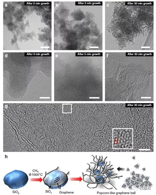 h) 爆米花狀石墨烯的生長(zhǎng)示意圖。