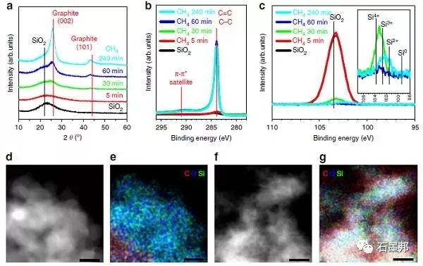 c) XPS中Si 2p峰; 在SiO2上生長(zhǎng)石墨烯d)-e)5min和f)-g)30min之后,C,O,Si的EDX圖。