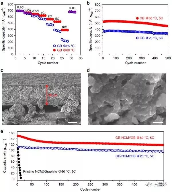 e) 石墨烯球-NCM/石墨烯球全電池在5C下25/60℃的長(zhǎng)循環(huán)特性。