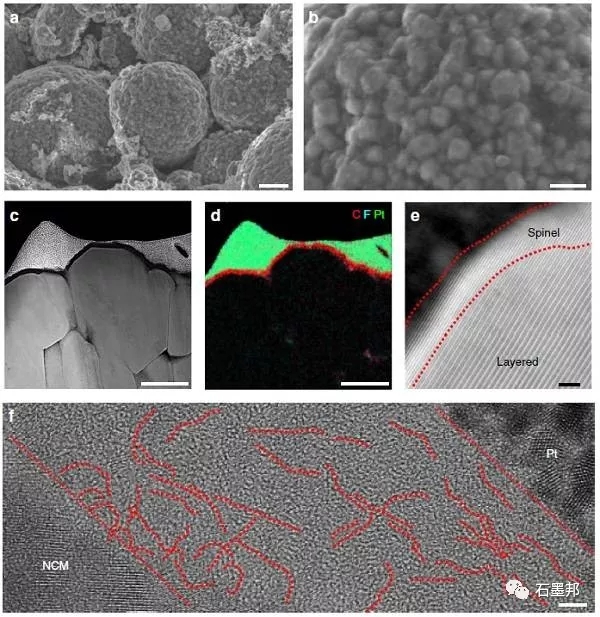 e) 石墨烯球-NCM表面的高倍STEM圖;