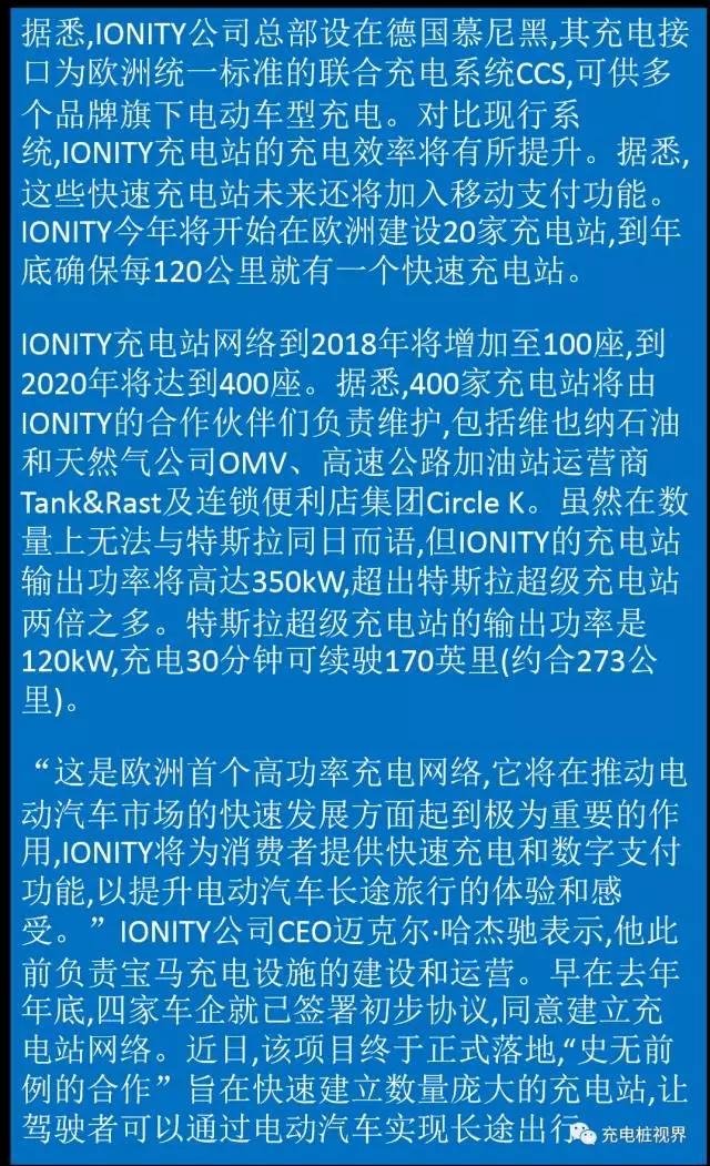 當(dāng)前,推廣電動(dòng)汽車在歐洲似乎已經(jīng)成為一項(xiàng)“全民運(yùn)動(dòng)”。一些歐洲國家,如英、法等國政府正在考慮禁售燃油車,沃爾沃、大眾等汽車制造商也紛紛發(fā)布雄心勃勃的電動(dòng)化戰(zhàn)略。除了推出電動(dòng)汽車產(chǎn)品,車企也在加快電動(dòng)汽車充電基礎(chǔ)設(shè)施建設(shè)。近日,在歐洲影響力最大的四家整車企業(yè)——大眾(包括奧迪和保時(shí)捷)、寶馬、戴姆勒和福特宣布成立IONITY公司,專注于研發(fā)大功率充電(HPC)網(wǎng)絡(luò)。根據(jù)規(guī)劃,IONITY計(jì)劃到2020年共同在歐洲地區(qū)建設(shè)400座快速充電站。