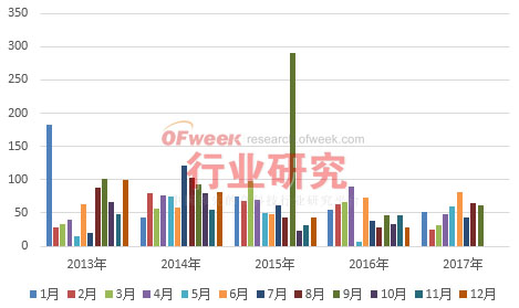 圖表1:2013年1月-2017年9月法國光伏裝機情況(單位:MW)