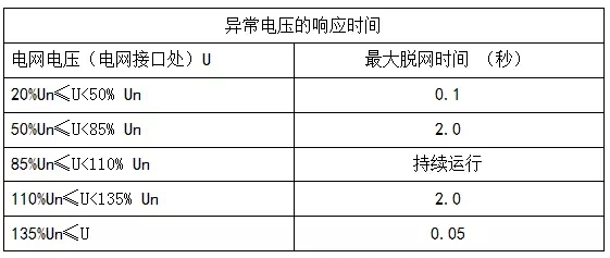 逆變器交流輸出端電壓超出電網(wǎng)允許電壓范圍時(shí),允許逆變器斷開(kāi)向電網(wǎng)供電,切斷時(shí)應(yīng)發(fā)出警示信號(hào)。除大功率逆變器外對(duì)異常電壓的響應(yīng)時(shí)間應(yīng)滿足表1的要求。在電網(wǎng)電壓恢復(fù)到允許的電壓范圍時(shí)逆變器應(yīng)能正常啟動(dòng)運(yùn)行。