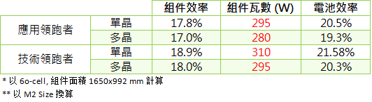 領(lǐng)跑者計劃實(shí)際上僅制定組件瓦數(shù)的門坎,因此業(yè)者除了在電池技術(shù)上提升外,亦可透過半切、雙面電池等技術(shù)來撐高瓦數(shù)表現(xiàn)。