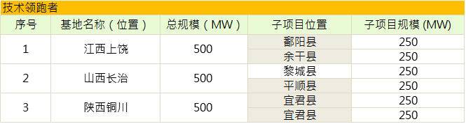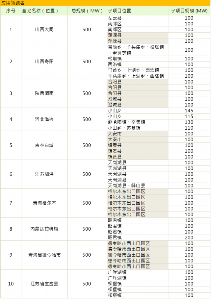 最后評選出來的基地共有13個,包括10個應(yīng)用領(lǐng)跑者基地(共5GW)和3個技術(shù)領(lǐng)跑者基地(共1.5GW),清單如下:
