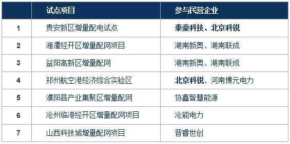 在國家電網(wǎng)經(jīng)營區(qū)域內(nèi),也產(chǎn)生了首家非國網(wǎng)控股的增量配電網(wǎng)業(yè)務(wù)試點項目產(chǎn)生,該項目是山西科技城綜合能源供應(yīng)試點項目,由國家電網(wǎng)、管委會政府和社會資本共同成立,其中國家電網(wǎng)占股49%;民營企業(yè)協(xié)鑫參與的三個增量配網(wǎng)項目(安徽金寨、河南濮陽、江蘇揚中)均與國家電網(wǎng)所屬公司合作。