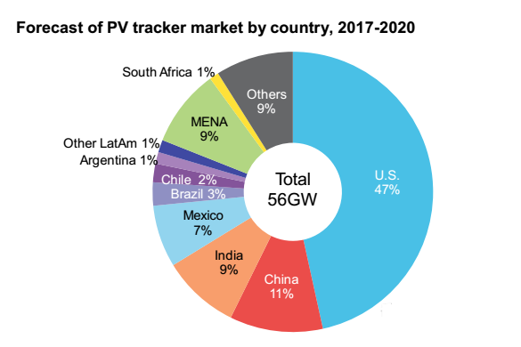 在彭博社的報(bào)告中指出,2016年全球太陽(yáng)能跟蹤支架總出貨量24.7GW,其中美國(guó)占78%,其它國(guó)家共占22%,而在2017年美國(guó)占比59%,其它國(guó)家共同占比41%,隨著本土政府向光伏的傾斜,光照資源好的地區(qū)如拉美、中東、非洲都將成為太陽(yáng)能跟蹤系統(tǒng)的新興市場(chǎng),主要集中在墨西哥、巴西、智利、阿根廷、約旦等國(guó)。