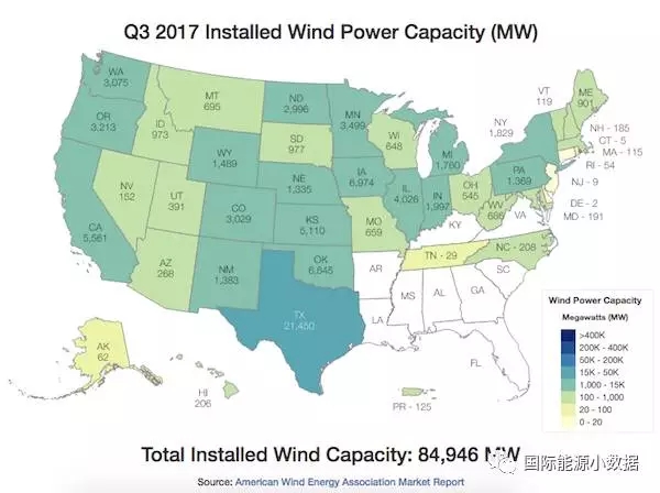 中國儲(chǔ)能網(wǎng)訊:根據(jù)美國風(fēng)能協(xié)會(huì)的最新數(shù)據(jù),到2017年9月底止全美風(fēng)電裝機(jī)累計(jì)達(dá)到84.946吉瓦,其中德克薩斯一個(gè)州就有21.450吉瓦,占全國總裝機(jī)的25%;其次為愛荷華州(6.974吉瓦)、俄克拉荷馬州(6.645吉瓦)、加利福尼亞州(5.561吉瓦)、堪薩斯州(5.110吉瓦)。