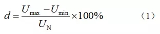 電壓波動(dòng)定義為電壓均方根值的一系列相對(duì)快速變動(dòng)或連續(xù)改變的現(xiàn)象。電壓波動(dòng)取值為一系列電壓均方根值變化中的相鄰兩個(gè)極值之差與標(biāo)稱電壓的相對(duì)百分?jǐn)?shù),其波動(dòng)大小可由式(1)計(jì)算得到。