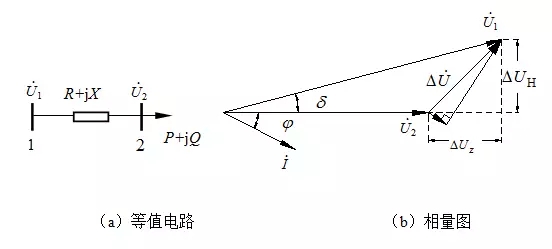 下面以最簡(jiǎn)單的輸電線路為例,來(lái)說(shuō)明無(wú)功功率與電壓損失的關(guān)系。圖2-1(a)是不計(jì)線路分布電容影響的一條輸電線路的等值電路,圖2-1(b)是對(duì)應(yīng)的相量圖。