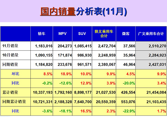 其中,SUV車(chē)型雖仍然保持同環(huán)比雙增長(zhǎng),但其增速已現(xiàn)放緩趨勢(shì)。11月,SUV車(chē)型共銷(xiāo)售1085415輛,環(huán)比增長(zhǎng)10.0%,同比增速則連續(xù)3個(gè)月出現(xiàn)下滑走勢(shì),本月下滑至12.9%的同比增速也拖累全年累計(jì)增幅下滑至16.5%。不過(guò),11月,SUV車(chē)型銷(xiāo)量?jī)H落后轎車(chē)銷(xiāo)量97601輛,完成對(duì)轎車(chē)銷(xiāo)量的超越指日可待。