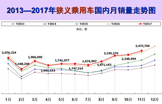12月8日,全國(guó)乘用車(chē)市場(chǎng)信息聯(lián)席會(huì)(以下簡(jiǎn)稱(chēng)“乘聯(lián)會(huì)”)發(fā)布數(shù)據(jù)顯示:2017年11月我國(guó)狹義乘用車(chē)銷(xiāo)量為2472704輛,同比增長(zhǎng)3.9%,環(huán)比漲幅為9.9%;綜合前11個(gè)月數(shù)據(jù),1-11月我國(guó)狹義乘用車(chē)?yán)塾?jì)銷(xiāo)量突破2千萬(wàn)輛,達(dá)到21027530輛,同比增長(zhǎng)2.3%。