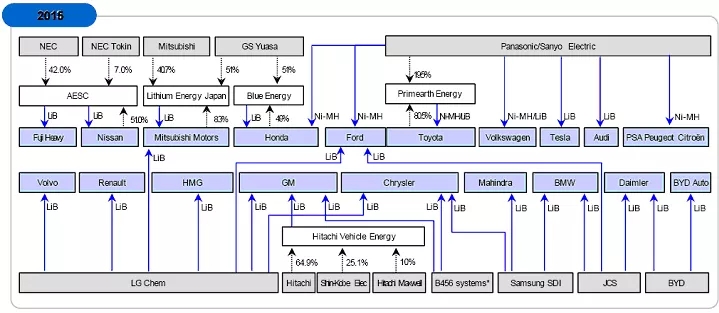 其實(shí),這些國際主流汽車廠商在電動汽車方面的戰(zhàn)略布局,還可以從他們跟電池汽車的關(guān)聯(lián)上管中窺豹。從HEV到PHEV再發(fā)展到EV,動力電池系統(tǒng)的成本比重越來越大,特斯拉ModelS的動力電池系統(tǒng)成本就已經(jīng)接近整車成本的60%。毫無疑問,動力電池系統(tǒng)是純電動汽車最為核心的部件,對于任何有志于在鋰電純電動車汽車上有所作為的國際主流車企,他們無論如何是不會讓這個最為關(guān)鍵的核心部件被外人掌控的。那么,國際主流汽車公司跟電池企業(yè)的關(guān)聯(lián),就是破解這些主流汽車廠家在純電動汽車方面戰(zhàn)略布局的一把鑰匙。