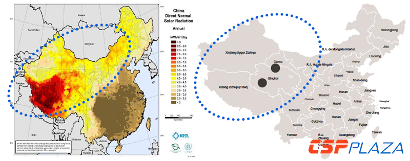 圖:中國西部沙漠地區(qū)DNI值普遍接近或超過2000kWh/m2/y(圖片來源:NREL)