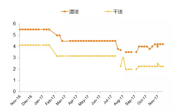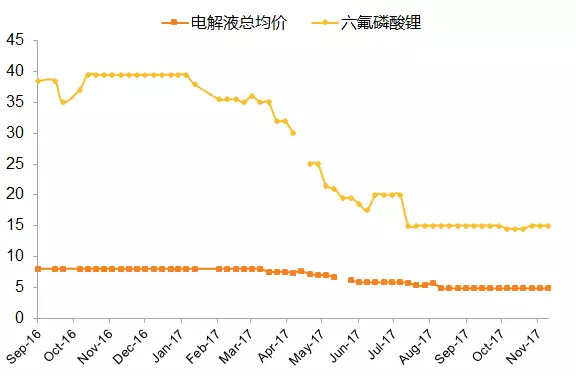 17年初開始,由于補(bǔ)貼下降和產(chǎn)能過剩,動(dòng)力電池進(jìn)入降價(jià)通道,上半年動(dòng)力電池均價(jià)對(duì)比16年下降20%以上。而在上游,碳酸鋰和鈷價(jià)持續(xù)高漲。上下游壓力的傳導(dǎo)集中在中游體現(xiàn),導(dǎo)致中游電池材料價(jià)格出現(xiàn)明顯分化。三元正極材料價(jià)格全年上漲,而磷酸鐵鋰正極材料、隔膜、電解液價(jià)格都出現(xiàn)明顯下滑,負(fù)極材料則在上半年的下滑后由于原材料針狀焦的拉動(dòng)在下半年出現(xiàn)漲價(jià)。中游價(jià)格的波動(dòng)與分化也對(duì)產(chǎn)業(yè)鏈帶來極大影響,正極材料對(duì)于鋰鈷、電池企業(yè)對(duì)于原材料的掌控能力差異成為競(jìng)爭(zhēng)的重要?jiǎng)儇?fù)手。