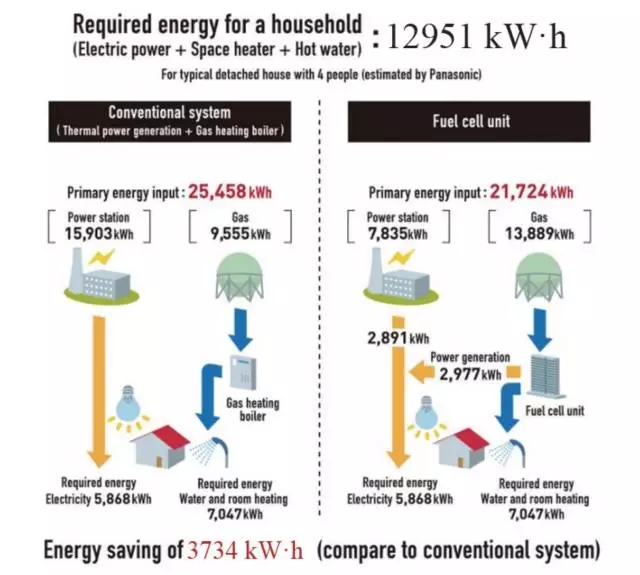 圖 1 為日本松下電器市場調(diào)研后得出的燃料電池直接發(fā)電與傳統(tǒng)間接發(fā)電的比較數(shù)據(jù)(4 口之家的年耗電量對比),相對于傳統(tǒng)間接發(fā)電,單個家庭通過燃料電池發(fā)電的能量消費方式 1 年可以節(jié)約 3734 kW·h 的電量 [2]。經(jīng)過多年的發(fā)展,目前燃料電池已逐漸應用在民用、交通、軍事等領域。
