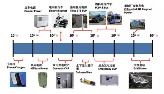 根據(jù)燃料電池的規(guī)模,不同功率大小的燃料電池有基本固定的應用領域,如圖 3 所示 [9]。根據(jù)燃料電池的分類,不同類型的燃料電池由于工作溫度、燃料適應性不同也有分別各自的應用空間。