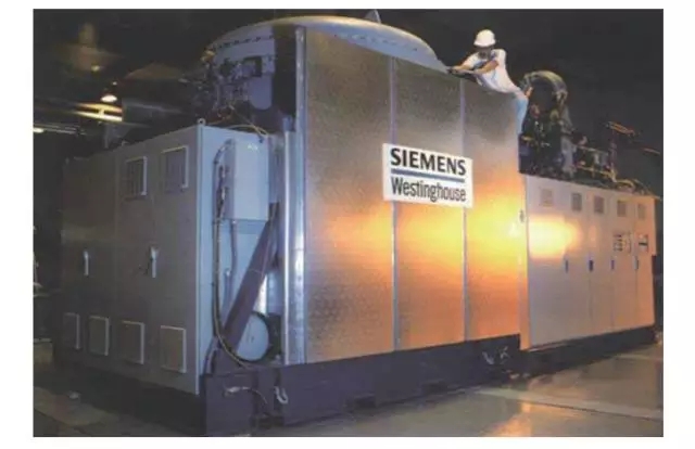 管式 SOFC 是最早被研究也是目前最接近商業(yè)化的發(fā)電技術。2002 年 5 月,西門子西屋公司與加州大學合作,在加州安裝了第 1 套 SOFC 與氣體渦輪機聯(lián)動發(fā)電系統(tǒng)(圖 10)[16],能量轉(zhuǎn)化效率高達 58%。除了西屋公司外,日本三菱重工長崎造船所、九州電力公司和東陶公司、德國海德堡中央研究所等也進行了 kW 級管狀結(jié)構(gòu) SOFC 發(fā)電試驗。