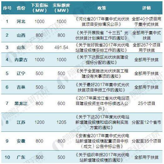 針對于2017年的光伏新增建設指標多數(shù)省份已經(jīng)下發(fā)分配情況,山東省、河北省、山西省、內(nèi)蒙古、遼寧省、吉林省、廣東省以及湖南省將全部指標用于光伏扶貧項目。