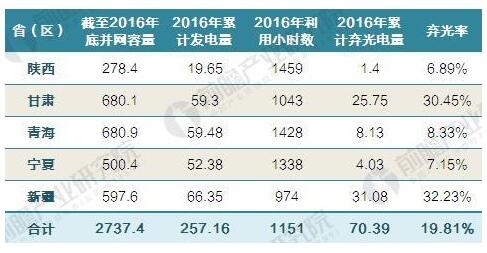 圖表8:2016年西北五省(區(qū))光伏發(fā)電利用及棄光率變化統(tǒng)計表(單位:萬千瓦,億千瓦時,%,小時,百分點)