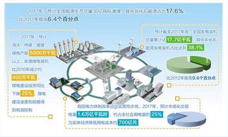 2017年,我國(guó)可再生能源發(fā)電裝機(jī)容量達(dá)到約6.56億千瓦,新增裝機(jī)規(guī)模占全球增量40%左右,風(fēng)電和光伏發(fā)電建設(shè)成本分別下降20%和60%。水電、風(fēng)電、太陽(yáng)能發(fā)電裝機(jī)和核電在建規(guī)模穩(wěn)居世界第一,成為全球非化石能源發(fā)展的引領(lǐng)者。清潔能源消納難題得到明顯緩解,2017年,預(yù)計(jì)全國(guó)水能利用率達(dá)到95%,棄風(fēng)率、棄光率同比分別下降6.7個(gè)和3.8個(gè)百分點(diǎn)。