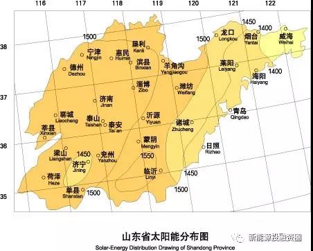 山東省太陽能資源從地域分布來看,從東向西逐漸增加。各市的太陽能資源概況見下表。