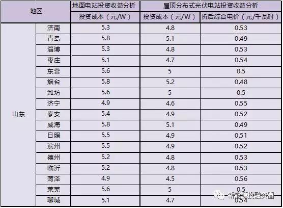 由于山東2017年新增500MW指標(biāo)全部用于光伏扶貧,所以本篇地面光伏按扶貧進行測算。根據(jù)上述模型參數(shù)測算地面電站投資成本(元/W),見最后表格。
