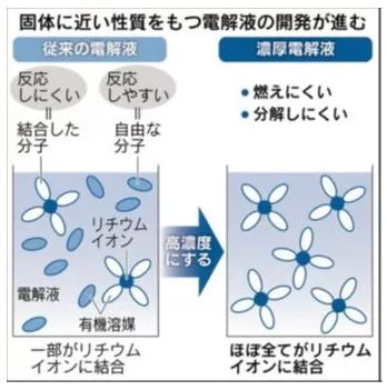 橫濱國立大學(xué)渡邊正義教授認(rèn)為:“通過使電解液變濃,就會變成接近固體的性質(zhì)?!彼窆腆w一樣不揮發(fā),同時(shí)具有不易燃燒的特征,這不正是我們希望得到的高安全電池嗎?渡邊教授等人開發(fā)成功了相當(dāng)于目前電解液濃度約3倍的高濃度電解液。