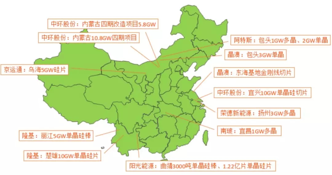 2017年硅片擴(kuò)產(chǎn)地區(qū)分布: