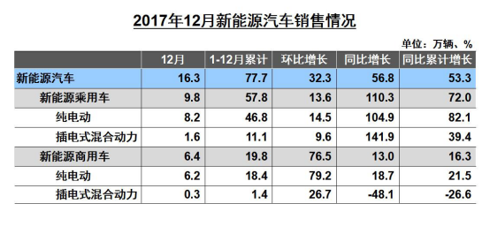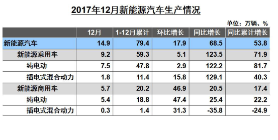 中國(guó)儲(chǔ)能網(wǎng)訊:近日,中國(guó)汽車工業(yè)協(xié)會(huì)對(duì)外發(fā)布數(shù)據(jù)顯示,新能源汽車12月生產(chǎn)14.9萬(wàn)輛,1-12月累計(jì)生產(chǎn)79.4萬(wàn)輛,環(huán)比增長(zhǎng)17.9%,同比增長(zhǎng)68.5%同比累計(jì)增長(zhǎng)53.8%。12月,新能源汽車銷售16.3萬(wàn)輛,1-12月累計(jì)銷售77.7萬(wàn)輛。環(huán)比增長(zhǎng)32.3%,同比增長(zhǎng)56.8%,同比累計(jì)增長(zhǎng)53.3%。