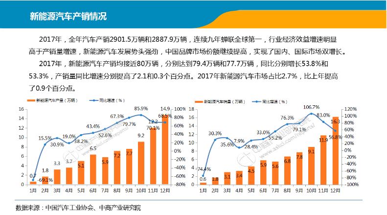 中國儲能網(wǎng)訊:2017年全年,中國汽車產(chǎn)銷2901.5萬輛和2887.9萬輛,連續(xù)九年蟬聯(lián)全球第一,行業(yè)經(jīng)濟效益增速明顯高于產(chǎn)銷量增速,新能源汽車發(fā)展勢頭強勁,中國品牌市場份額繼續(xù)提高,實現(xiàn)了國內(nèi)、國際市場雙增長。