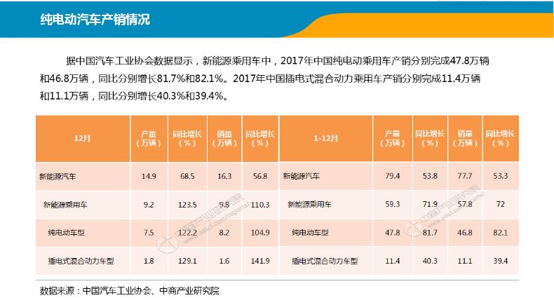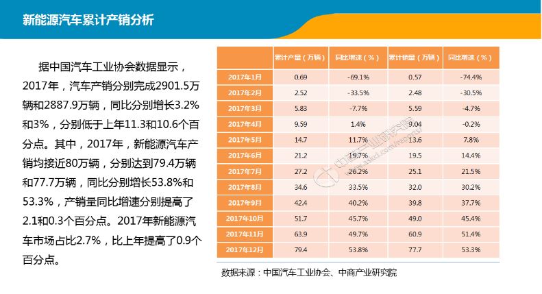 其中,2017年新能源汽車產(chǎn)銷均接近80萬輛,分別達到79.4萬輛和77.7萬輛,同比分別增長53.8%和53.3%,產(chǎn)銷量同比增速分別提高了2.1和0.3個百分點。2017年新能源汽車市場占比2.7%,比上年提高了0.9個百分點。