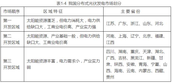 此外,國(guó)家和各級(jí)政府為了推廣分布式光伏也都陸續(xù)發(fā)布了相應(yīng)的補(bǔ)貼政策,廣大老百姓已經(jīng)在政策補(bǔ)貼和環(huán)保意識(shí)的驅(qū)動(dòng)下,對(duì)分布式光伏發(fā)電從感興趣,想了解到紛紛投資建設(shè),方興未艾,如火如荼。大大小小的光伏企業(yè)也紛紛進(jìn)入該領(lǐng)域,八仙過(guò)海各顯神通,力求分得一塊蛋糕。我國(guó)中東部地區(qū)的浙江省、江蘇省、安徽省、山東省等已經(jīng)成為分布式光伏發(fā)電規(guī)模較大、增長(zhǎng)快速的地區(qū),光伏項(xiàng)目從資源更好的西北地區(qū)向中東部轉(zhuǎn)移,說(shuō)明電網(wǎng)消納和政策環(huán)境已經(jīng)成為影響投資決策的更重要因素,也就是說(shuō),電力需求規(guī)模越大,電力供給缺口越大,工商業(yè)電價(jià)越高,太陽(yáng)能資源越豐富,太陽(yáng)能產(chǎn)業(yè)基礎(chǔ)越雄厚,對(duì)分布式光伏發(fā)電項(xiàng)目的需求就越大。根據(jù)上述規(guī)律,對(duì)我國(guó)分布式光伏發(fā)電市場(chǎng)的劃分如表1-4所示。
