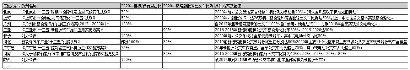 國家及地方政策要求繼續(xù)推進(jìn)新能源汽車發(fā)展,部分政府通過出臺(tái)區(qū)域“十三五節(jié)能降耗規(guī)劃”、《新能源汽車十三五發(fā)展規(guī)劃》、《氣候變化規(guī)劃》、《新能源汽車推廣應(yīng)用》及發(fā)布“對(duì)外公告”等方式推進(jìn),其中廣東省、廣州市公交車電動(dòng)化全面推進(jìn),預(yù)計(jì)2020年全省達(dá)標(biāo)75%,而廣州市將100%實(shí)現(xiàn)公交電動(dòng)化。