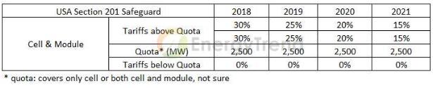 根據(jù)美國(guó)ITC所公告的Fact Sheet(https://ustr.gov/sites/default/files/files/Press/fs/201%20Cases%20Fact%20Sheet.pdf),太陽(yáng)能電池與模塊之201條款最后決定的方案如下: