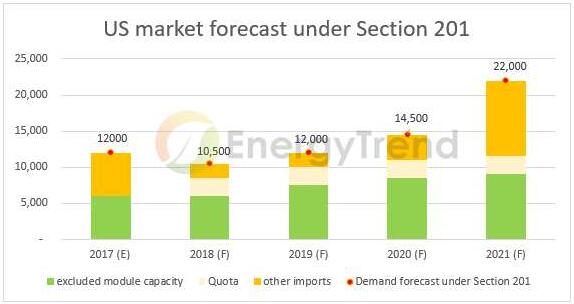 根據(jù)EnergyTrend的海關(guān)資料統(tǒng)計(jì),美國(guó)目前已有5~6GW的組件庫(kù)存,因此1H18幾乎不會(huì)有拉貨需求,2H18也會(huì)優(yōu)先向上述不受201案影響的產(chǎn)能采購(gòu)。