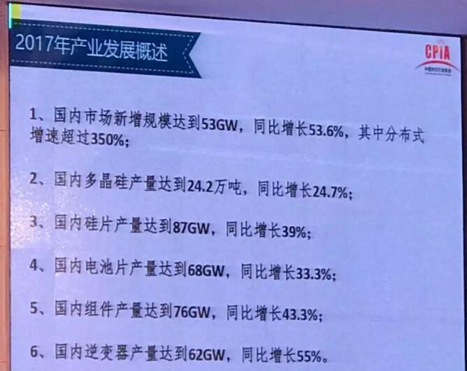 中國儲能網(wǎng)訊:1月24日,光伏行業(yè)2017年發(fā)展回顧與2018年展望研討會在京如期舉行。會上,中國光伏行業(yè)協(xié)會副理事長兼秘書長王勃華作了《我國光伏產(chǎn)業(yè)發(fā)展情況——2017年回顧與2018年展望》的報告。匯報如下: